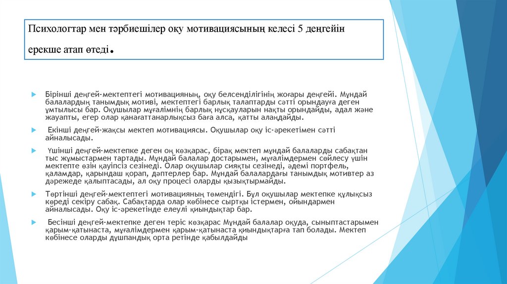 Психологтар мен тәрбиешілер оқу мотивациясының келесі 5 деңгейін.