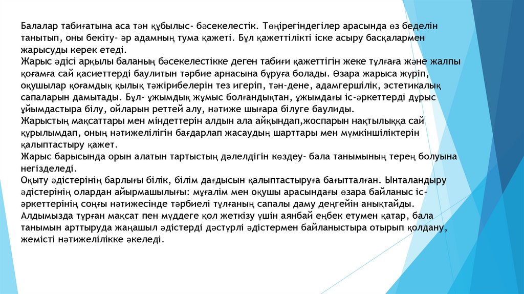 Жарыс әдісі арқылы баланың бәсекелестікке деген табиғи қажеттігін жеке тұлғаға және жалпы