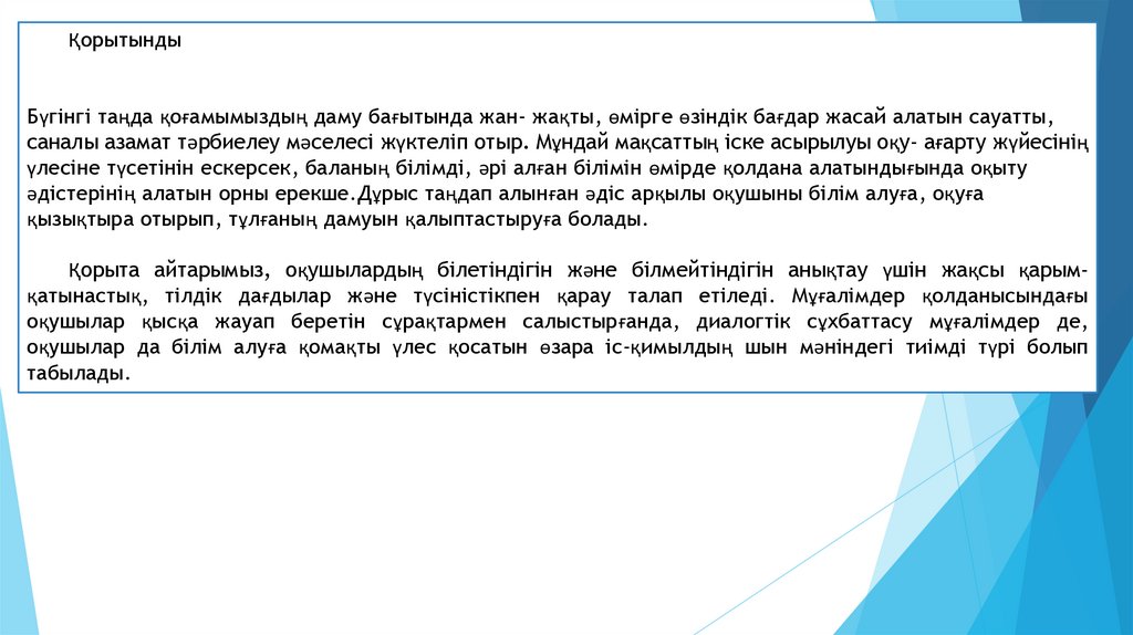 ҚорытындыБүгінгі таңда қоғамымыздың даму бағытында жан- жақты, өмірге өзіндік бағдар жасай алатын сауатты,