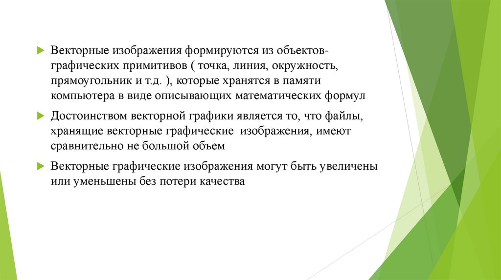Векторные изображения формируются из объектовграфических примитивов ( точка, линия, окружность,прямоугольник и т.д. ), которые хранятся в памяти