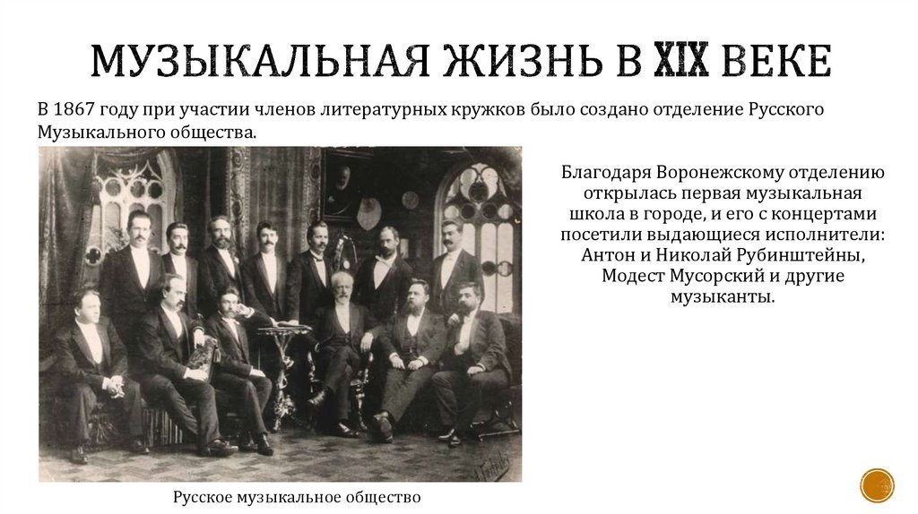 В 1867 году при участии членов литературных кружков было создано отделение РусскогоМузыкального общества.