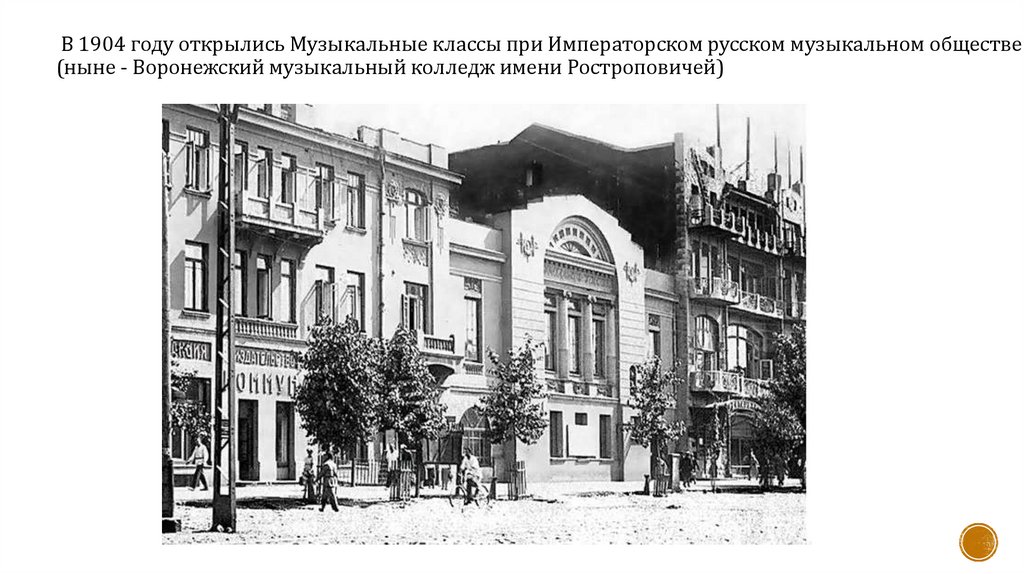 В 1904 году открылись Музыкальные классы при Императорском русском музыкальном обществе(ныне - Воронежский музыкальный колледж имени Ростроповичей)