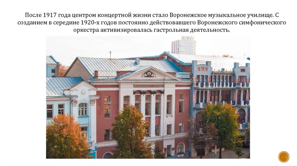 После 1917 года центром концертной жизни стало Воронежское музыкальное училище. Ссозданием в середине 1920-х годов постоянно действовавшего Воронежского симфонического