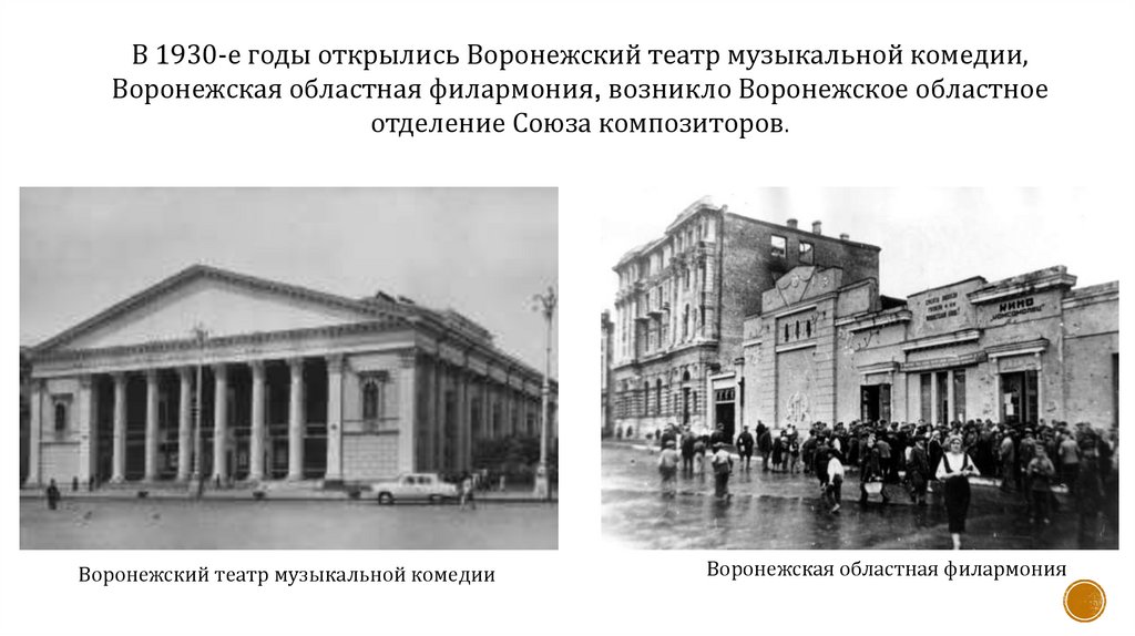 В 1930-е годы открылись Воронежский театр музыкальной комедии,Воронежская областная филармония, возникло Воронежское областное