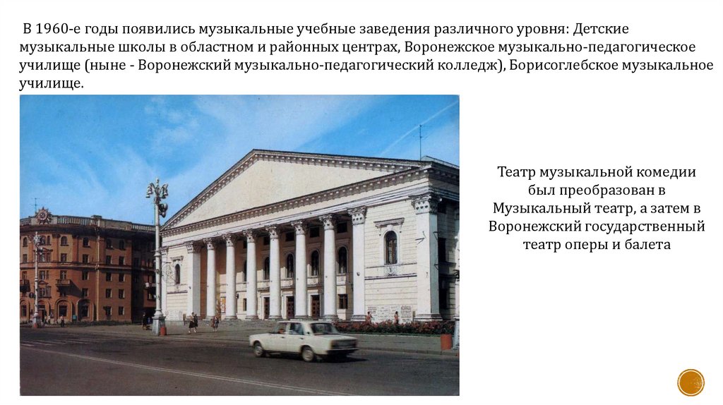 В 1960-е годы появились музыкальные учебные заведения различного уровня: Детскиемузыкальные школы в областном и районных центрах, Воронежское музыкально-педагогическое
