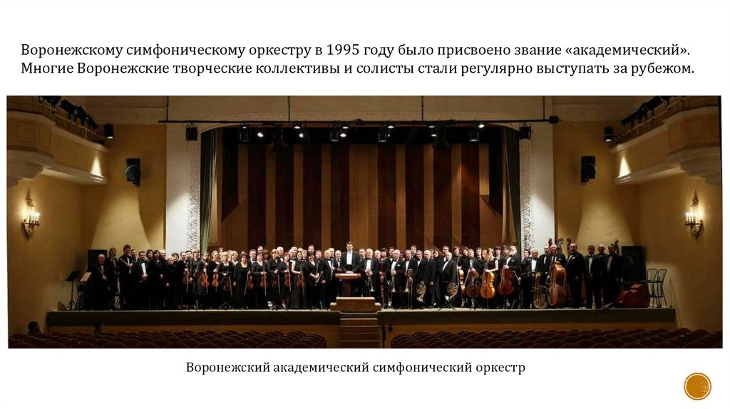 Воронежскому симфоническому оркестру в 1995 году было присвоено звание «академический».Многие Воронежские творческие коллективы и солисты стали регулярно выступать за рубежом.
