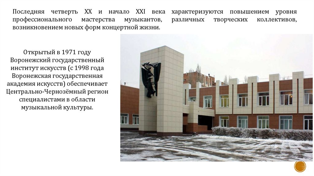 Последняя четверть XX и начало XXI века характеризуются повышением уровняпрофессионального мастерства музыкантов, различных творческих коллективов,