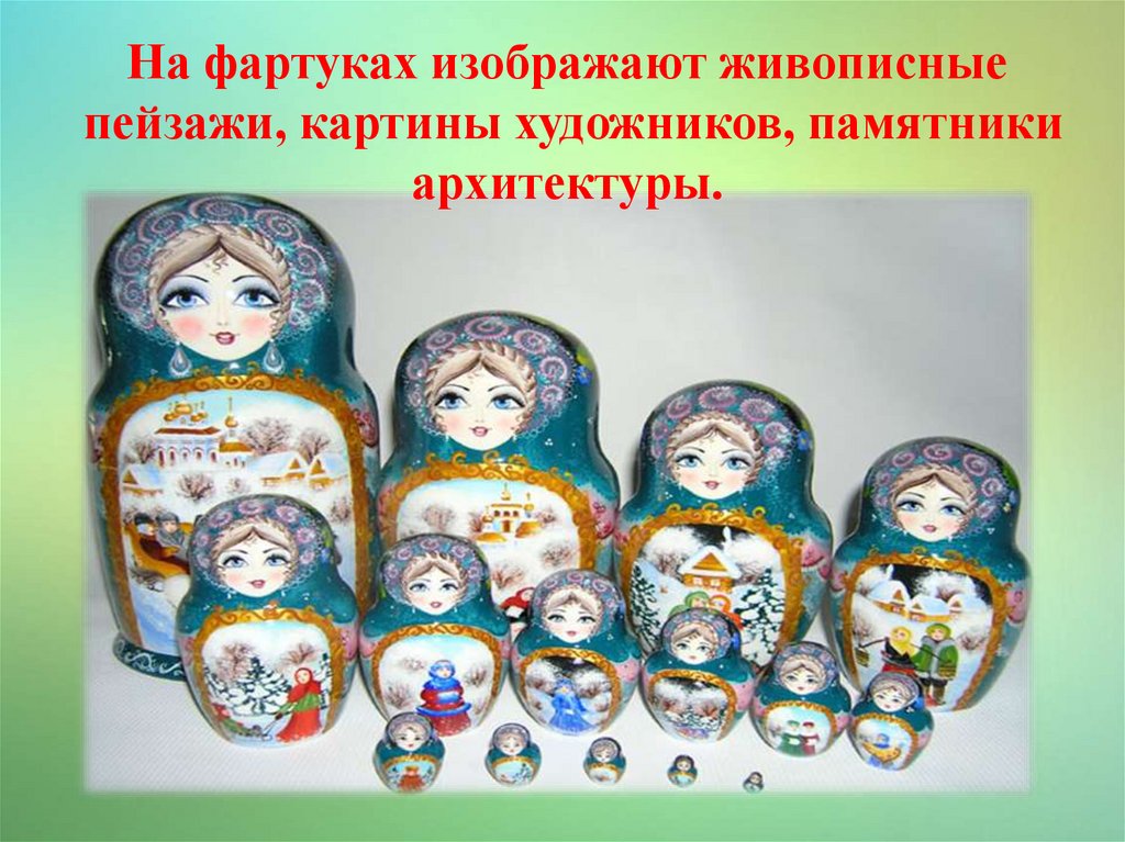 На фартуках изображают живописныепейзажи, картины художников, памятники