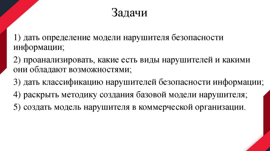 Задачи1) дать определение модели нарушителя безопасности