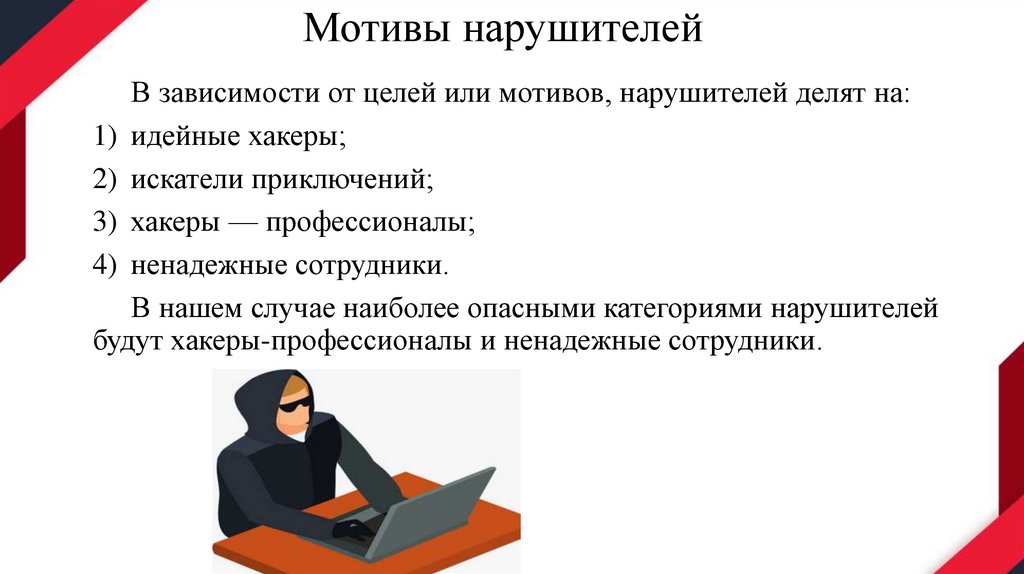 Мотивы нарушителейВ зависимости от целей или мотивов, нарушителей делят на: