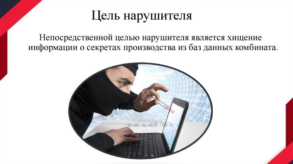 Цель нарушителяНепосредственной целью нарушителя является хищение