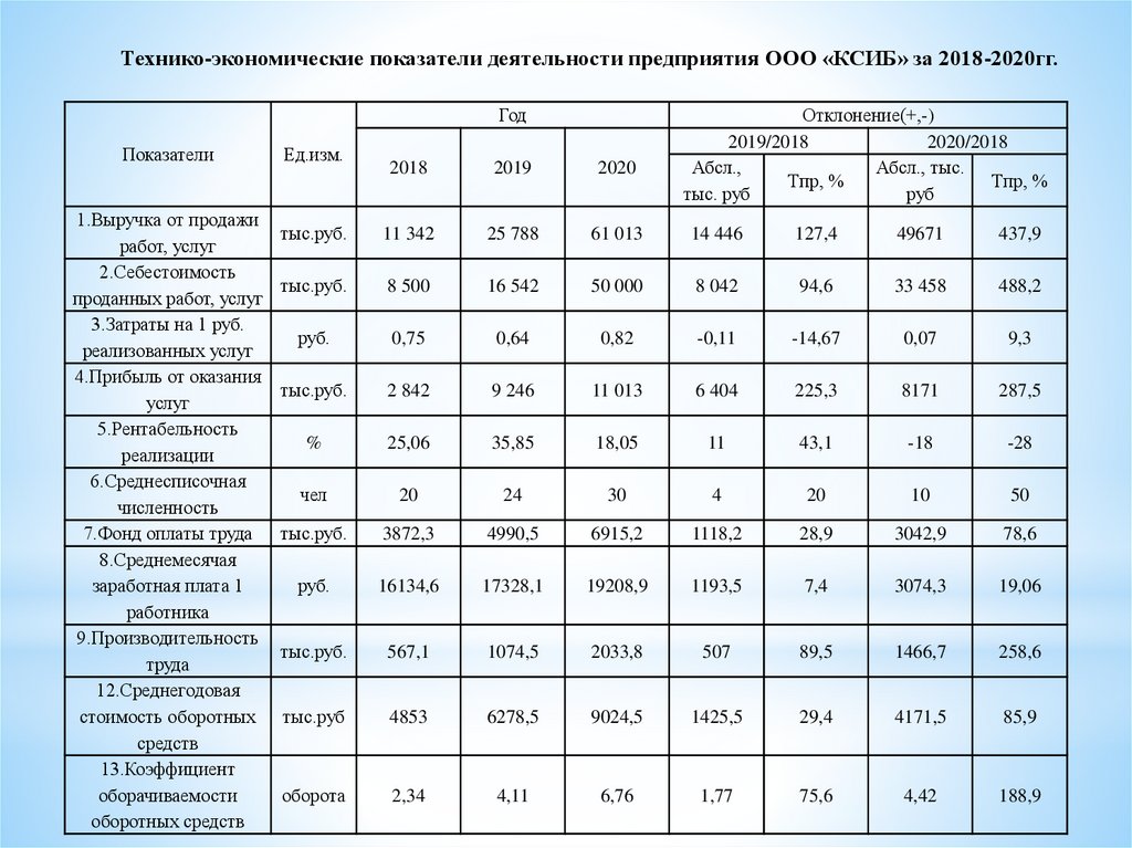 Технико-экономические показатели деятельности предприятия ООО «КСИБ» за 2018-2020гг.Год