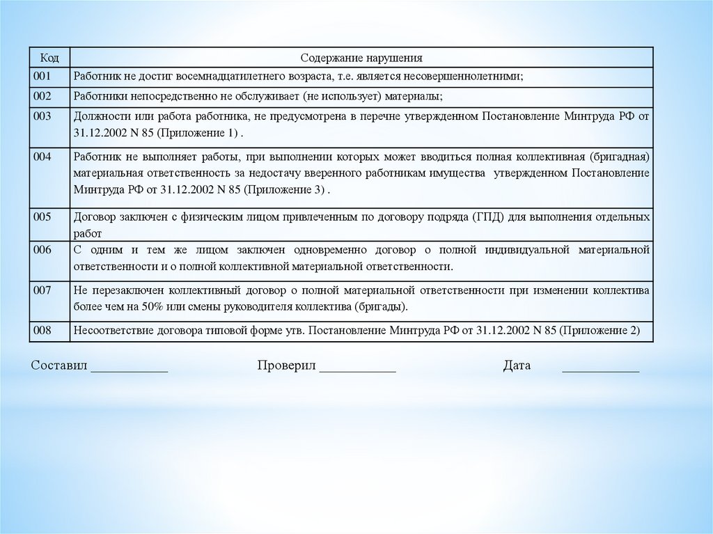 ПРОВЕРКА ДОГОВОРОВ О ПОЛНОЙ МАТЕРИАЛЬНОЙ ОТВЕТСТВЕННОСТИ С