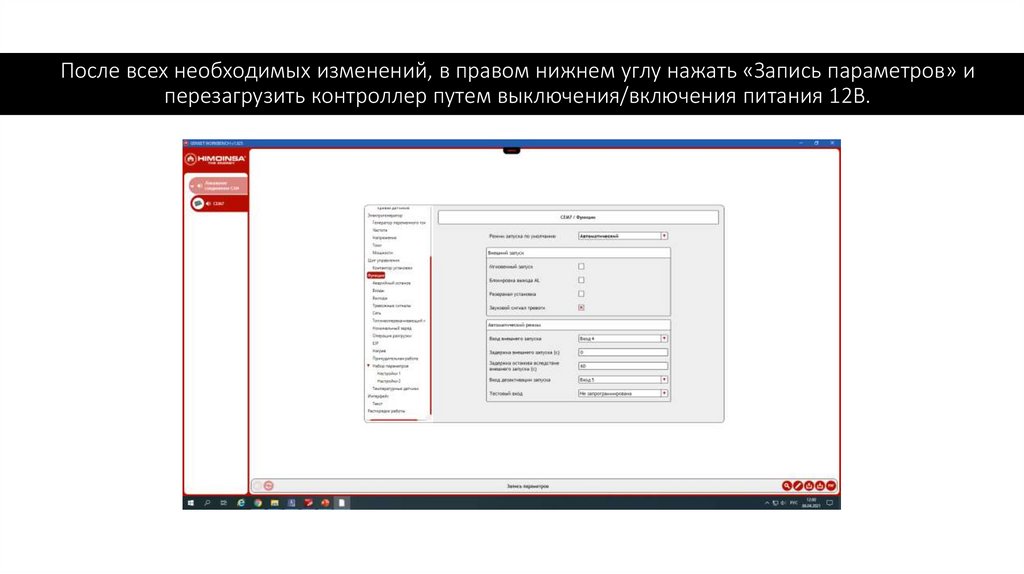 После всех необходимых изменений, в правом нижнем углу нажать «Запись параметров» иперезагрузить контроллер путем выключения/включения питания 12В.