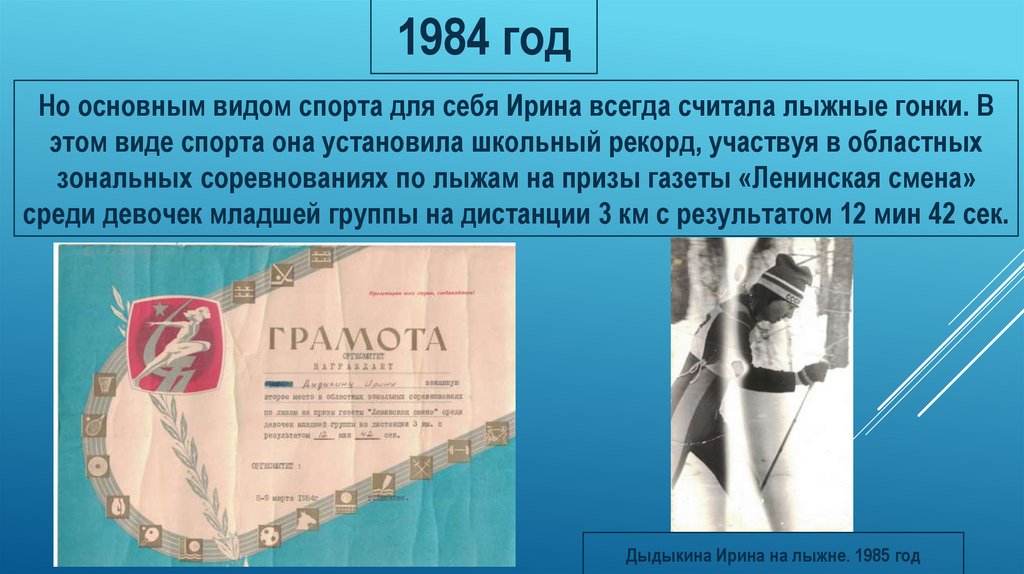 1984 годНо основным видом спорта для себя Ирина всегда считала лыжные гонки. В