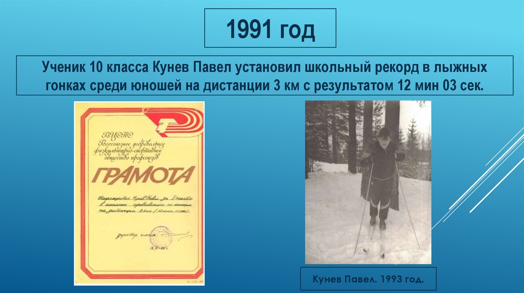 1991 годУченик 10 класса Кунев Павел установил школьный рекорд в лыжных