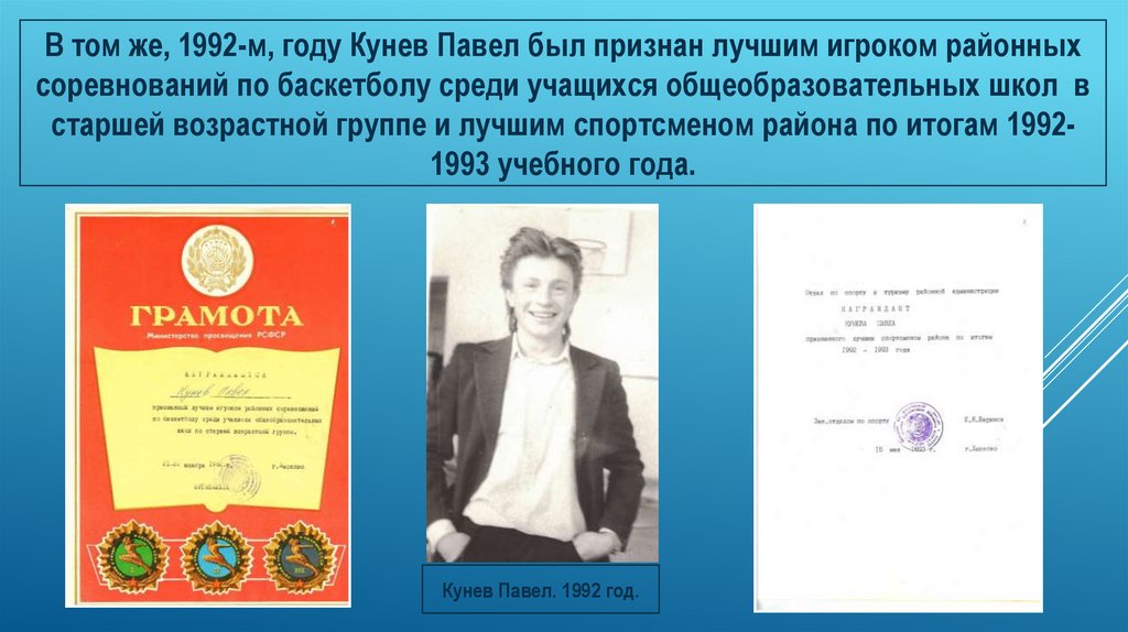 В том же, 1992-м, году Кунев Павел был признан лучшим игроком районныхсоревнований по баскетболу среди учащихся общеобразовательных школ в