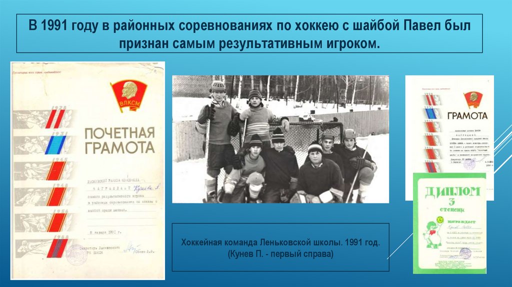 В 1991 году в районных соревнованиях по хоккею с шайбой Павел былпризнан самым результативным игроком.