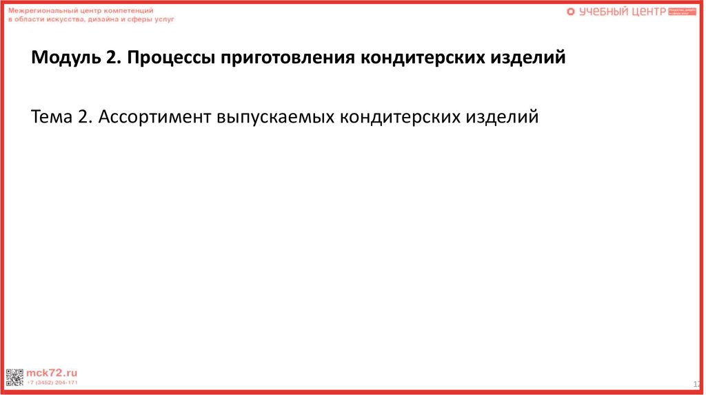 Модуль 2. Процессы приготовления кондитерских изделийТема 2. Ассортимент выпускаемых кондитерских изделий