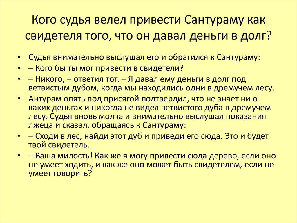 Кого судья велел привести Сантураму каксвидетеля того, что он давал деньги в долг?