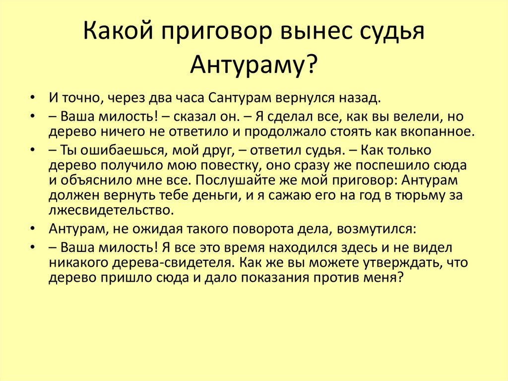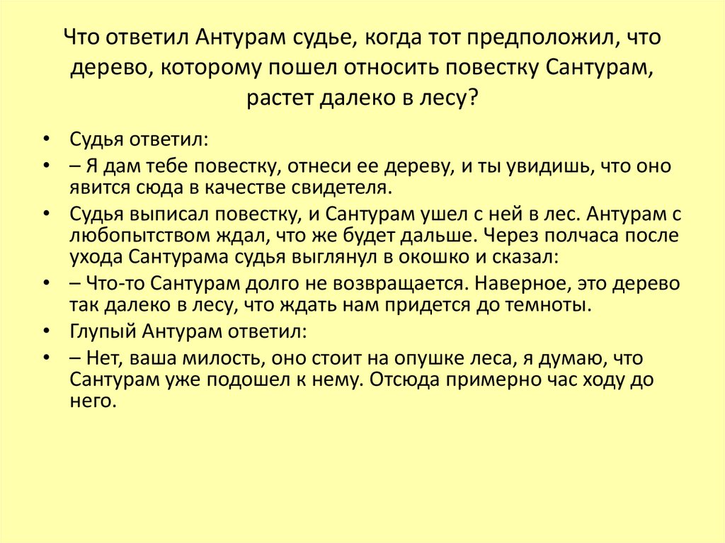 Что ответил Антурам судье, когда тот предположил, чтодерево, которому пошел относить повестку Сантурам,