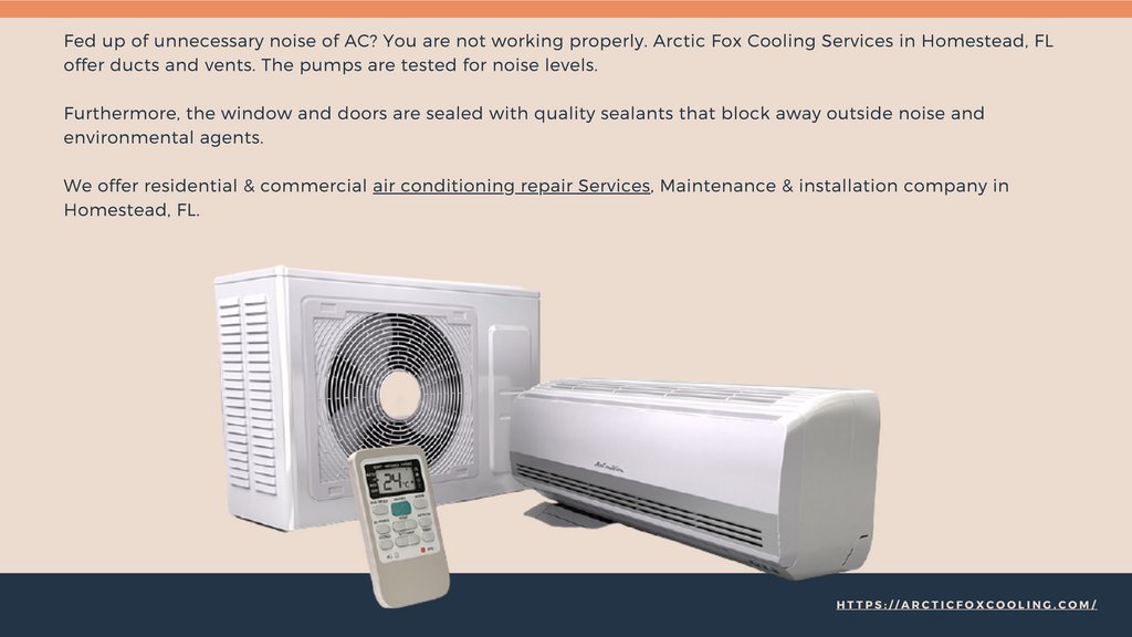 Fed up of unnecessary noise of AC? You are not working properly. Arctic Fox Cooling Services in Homestead, FLoffer ducts and vents. The pumps are tested for noise levels.