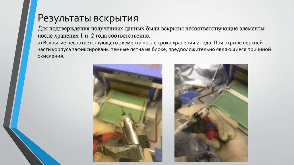 а) Вскрытие несоответствующего элемента после срока хранения 2 года. При отрыве верхней