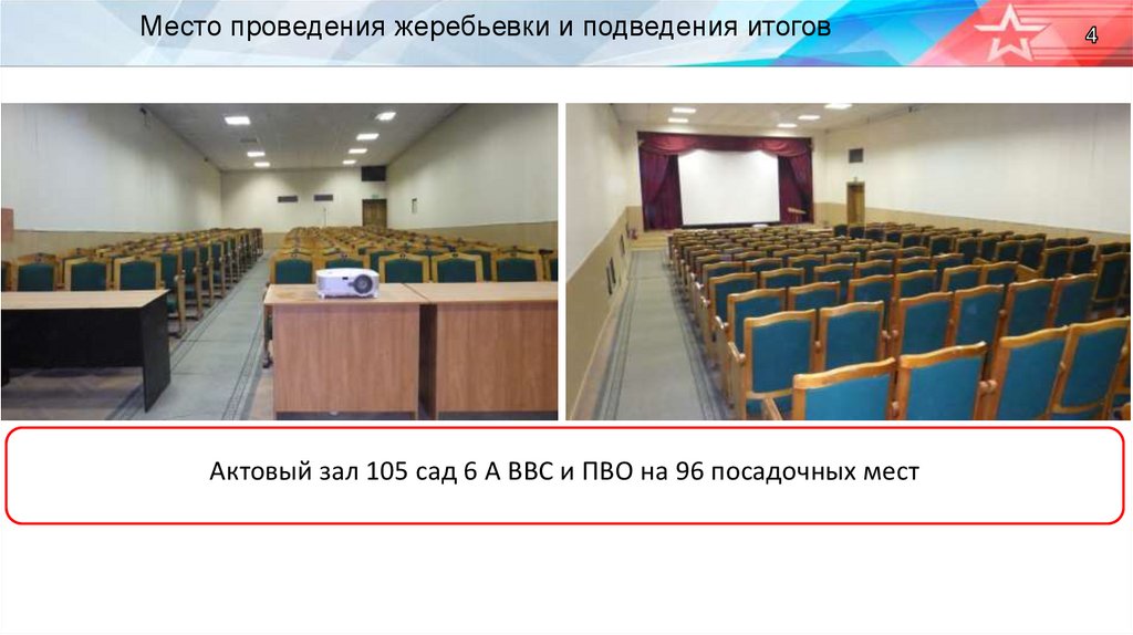 Место проведения жеребьевки и подведения итоговАктовый зал 105 сад 6 А ВВС и ПВО на 96 посадочных мест