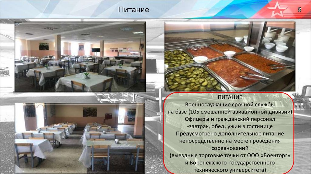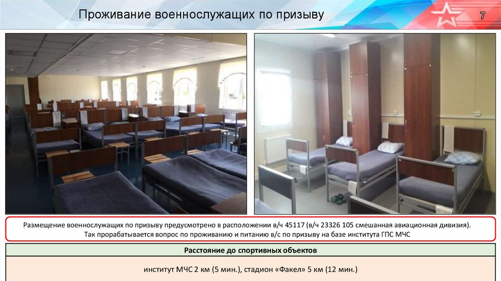 Проживание военнослужащих по призывуРазмещение военнослужащих по призыву предусмотрено в расположении в/ч 45117 (в/ч 23326 105 смешанная авиационная дивизия).