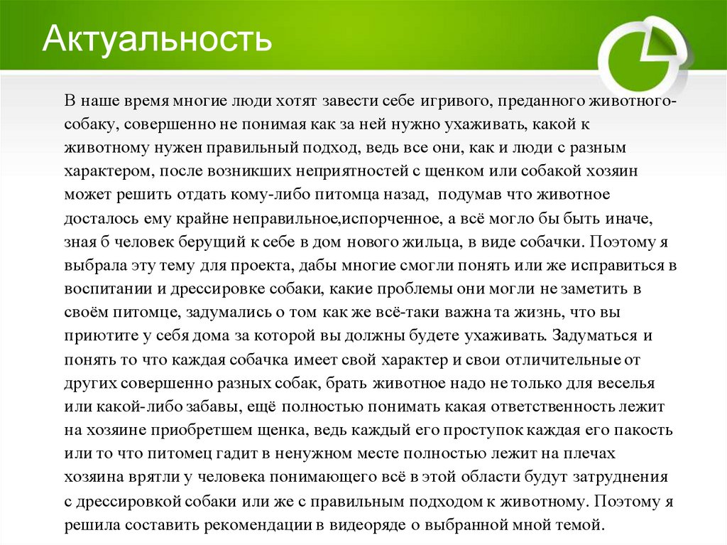 АктуальностьВ наше время многие люди хотят завести себе игривого, преданного животногособаку, совершенно не понимая как за ней нужно ухаживать, какой к