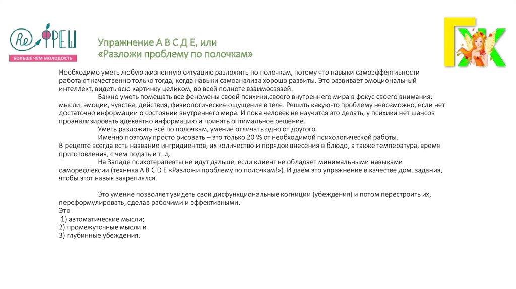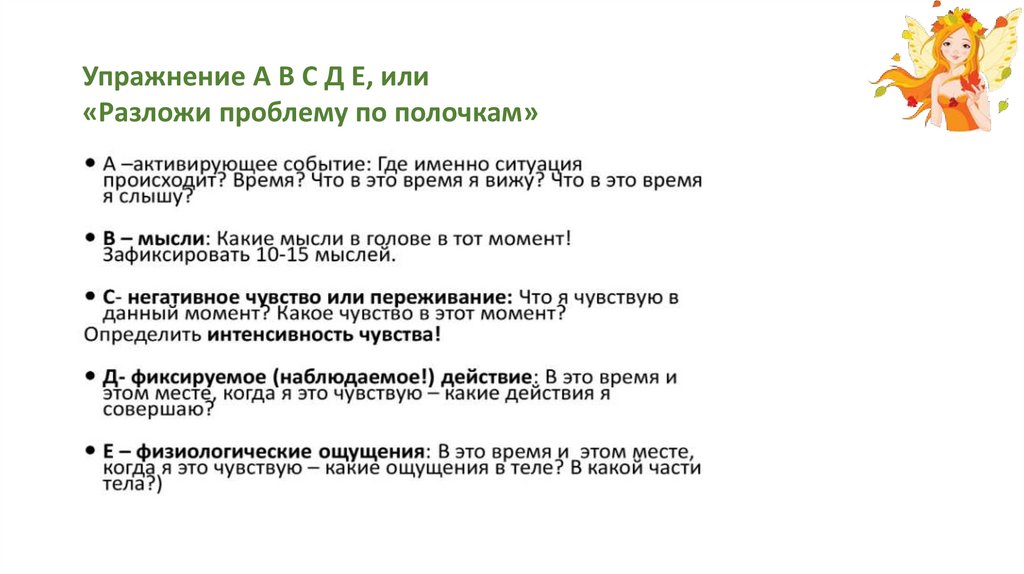 саморефлексии (техника A B C D E «Разложи проблему по полочкам!»). И даём это упражнение в качестве дом. задания,