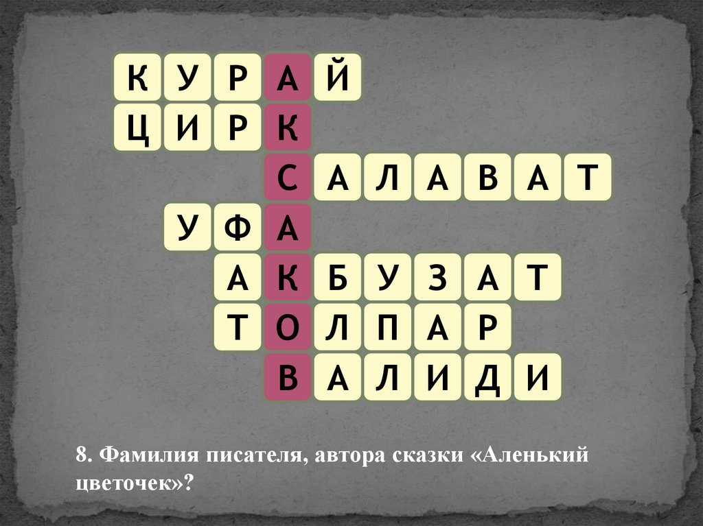 8. Фамилия писателя, автора сказки «Аленький
