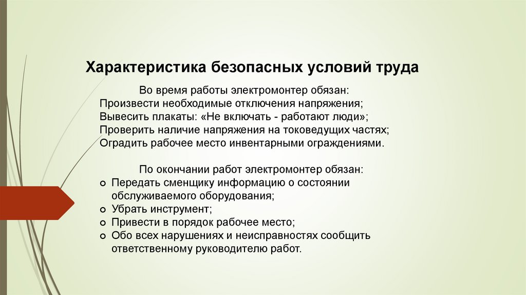 Характеристика безопасных условий трудаВо время работы электромонтер обязан: