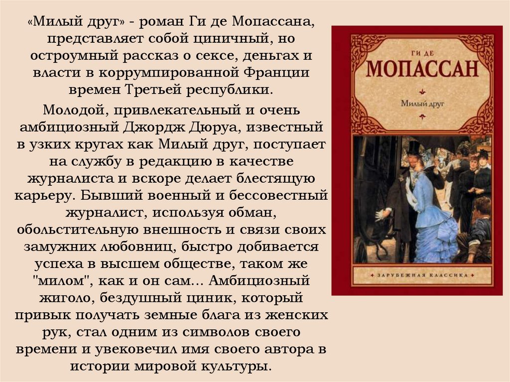 «Милый друг» - роман Ги де Мопассана,представляет собой циничный, но