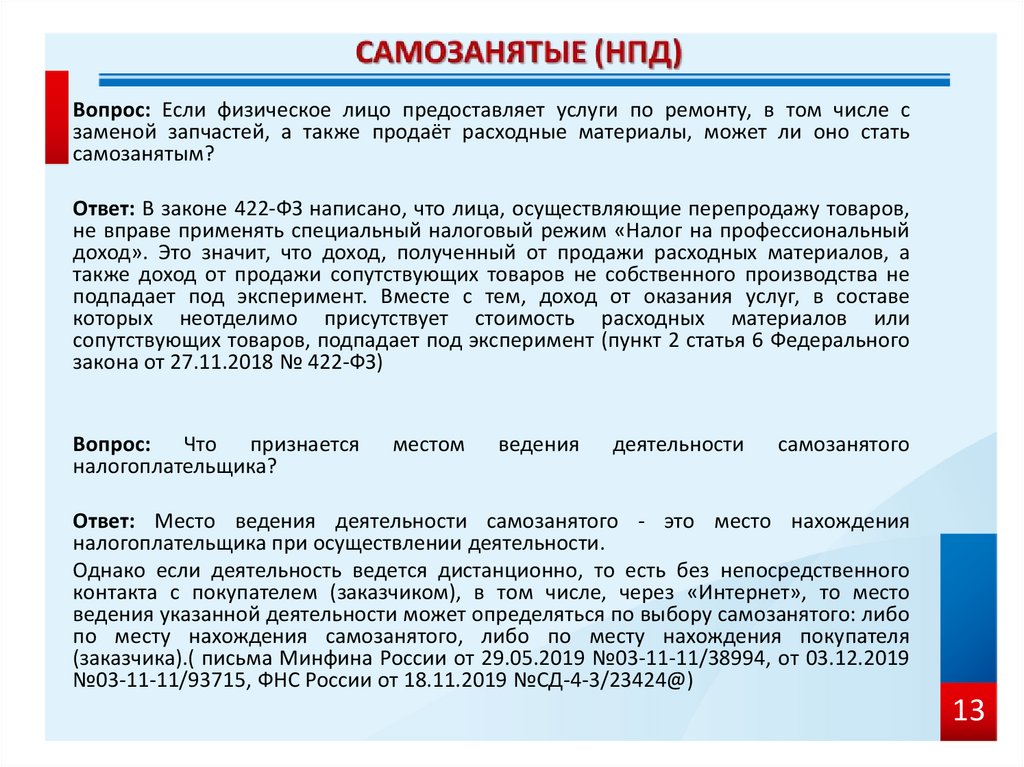 САМОЗАНЯТЫЕ (НПД)(Федеральный закон от 27.11.2018 N 422-ФЗ)