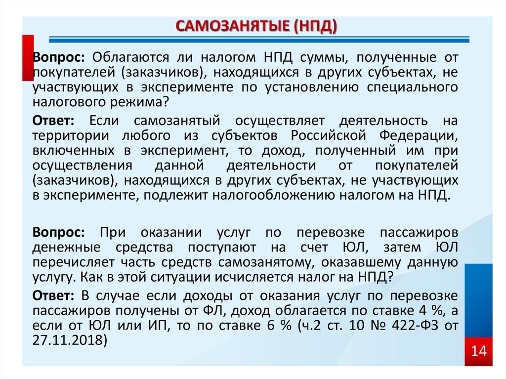 Вопрос: Облагаются ли налогом НПД суммы, полученные отпокупателей (заказчиков), находящихся в других субъектах, не