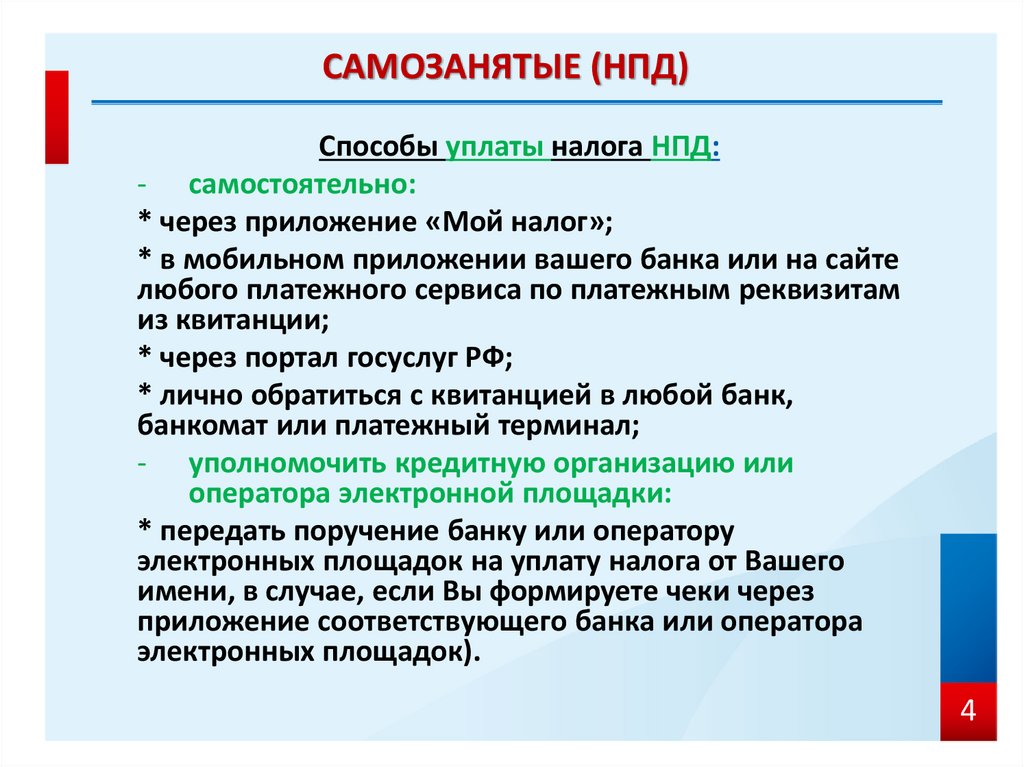 САМОЗАНЯТЫЕ (НПД)Способы уплаты налога НПД: