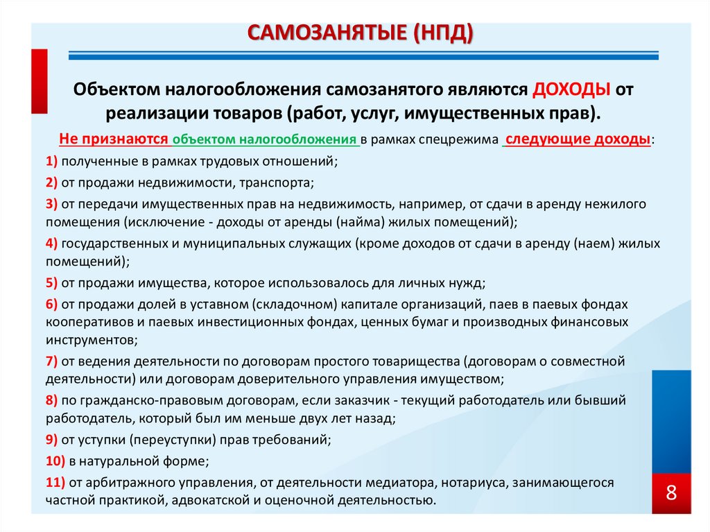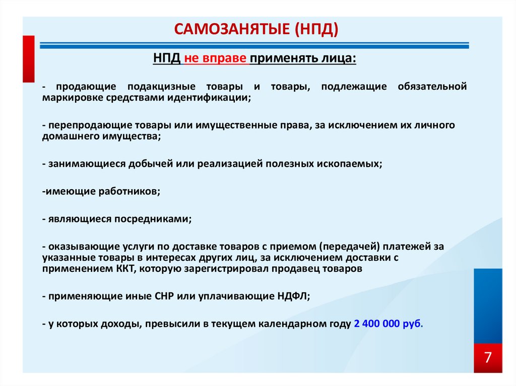САМОЗАНЯТЫЕ (НПД)Применение НПД возможно при соблюдении ограничений, установленных