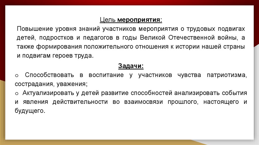 Цель мероприятия:Повышение уровня знаний участников мероприятия о трудовых подвигах