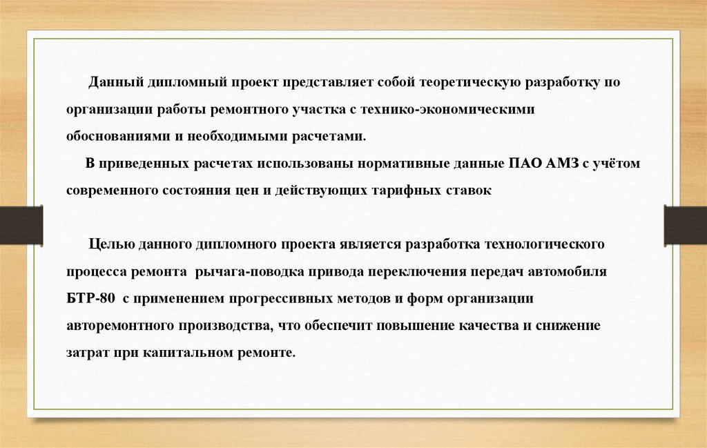 Данный дипломный проект представляет собой теоретическую разработку поорганизации работы ремонтного участка с технико-экономическими