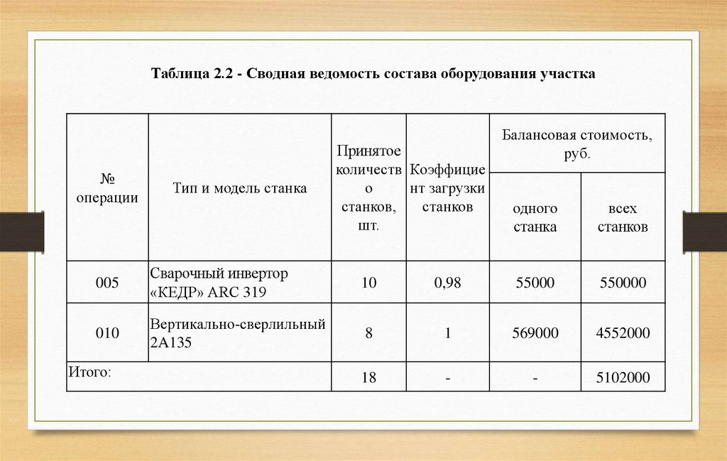 Таблица 2.2 - Сводная ведомость состава оборудования участка№