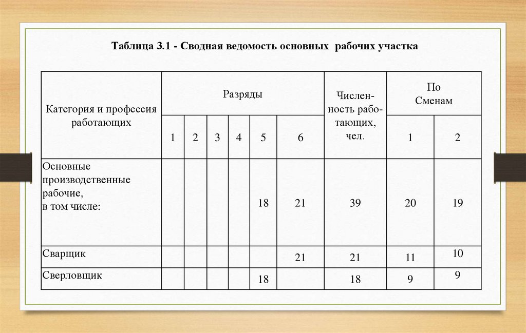 Таблица 3.1 - Сводная ведомость основных рабочих участкаРазряды