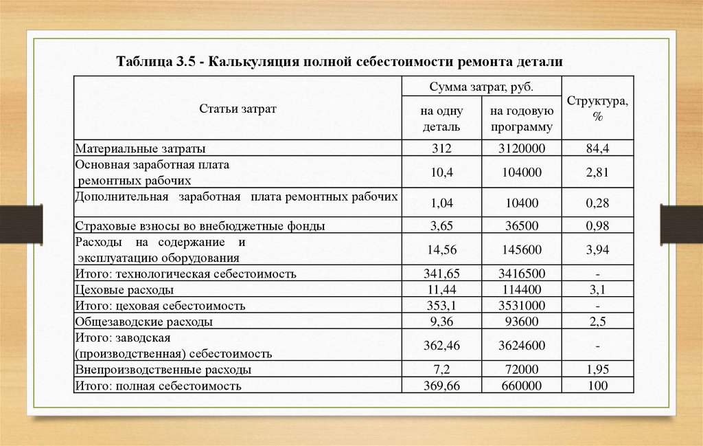 Таблица 3.5 - Калькуляция полной себестоимости ремонта деталиСумма затрат, руб.