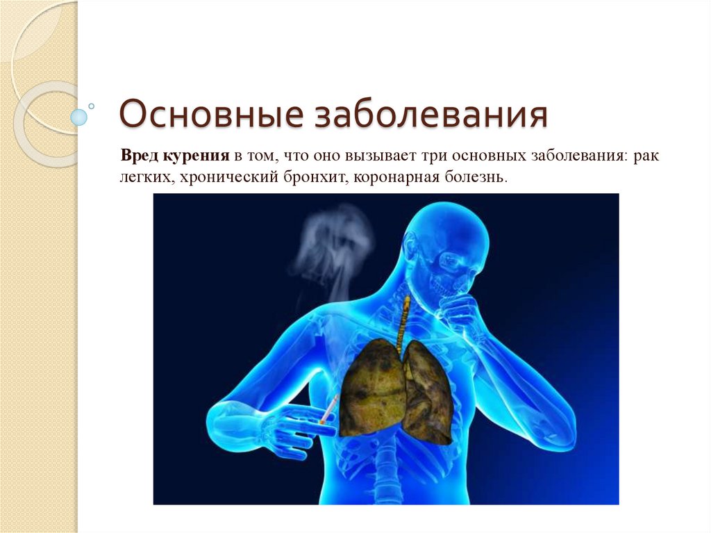 Основные заболеванияВред курения в том, что оно вызывает три основных заболевания: рак