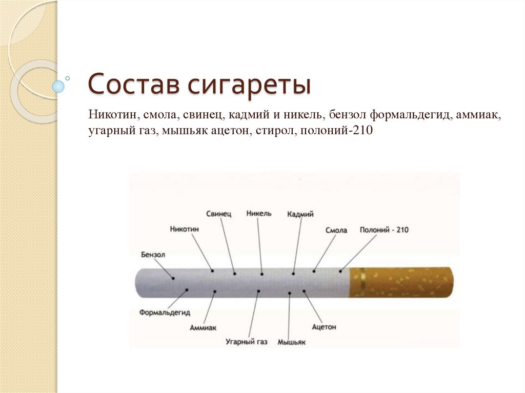 Состав сигаретыНикотин, смола, свинец, кадмий и никель, бензол формальдегид, аммиак,