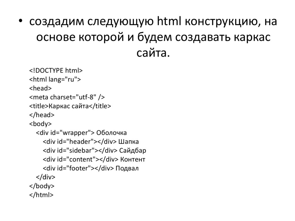 • создадим следующую html конструкцию, наоснове которой и будем создавать каркас
