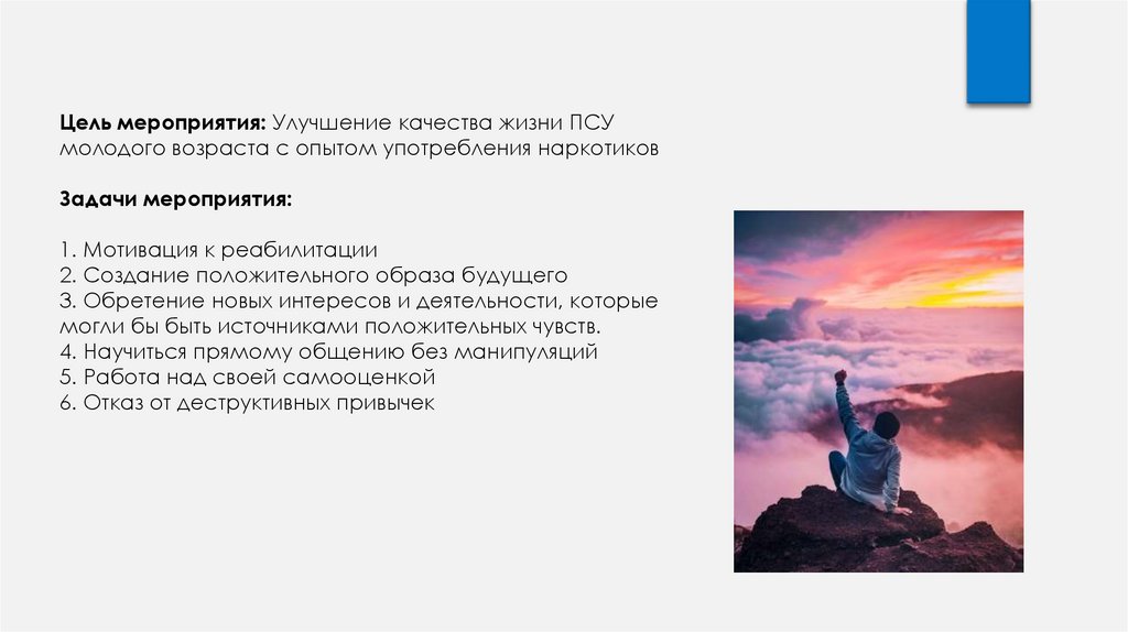 Цель мероприятия: Улучшение качества жизни ПСУмолодого возраста с опытом употребления наркотиков