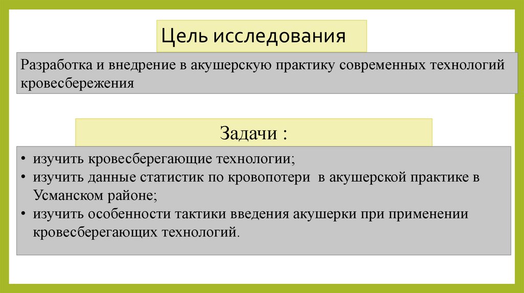 Цель исследованияРазработка и внедрение в акушерскую практику современных технологий