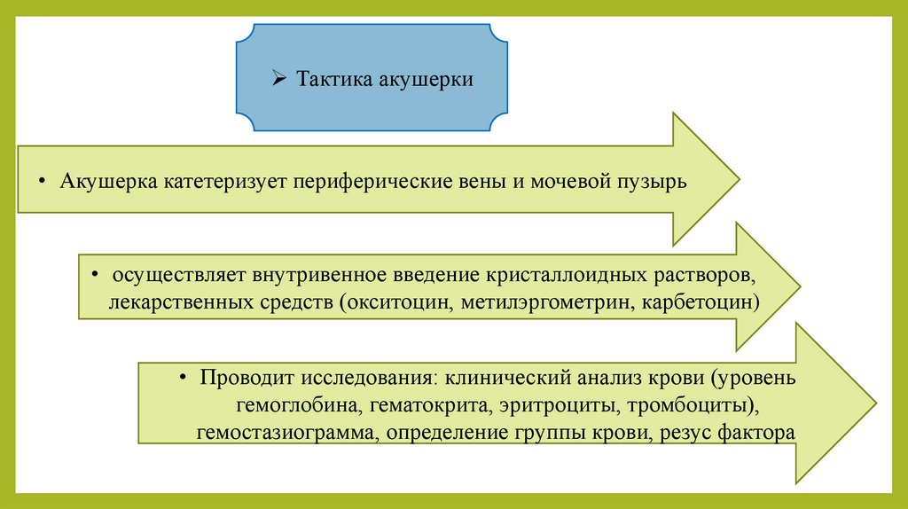 Тактика акушерки• Акушерка катетеризует периферические вены и мочевой пузырь