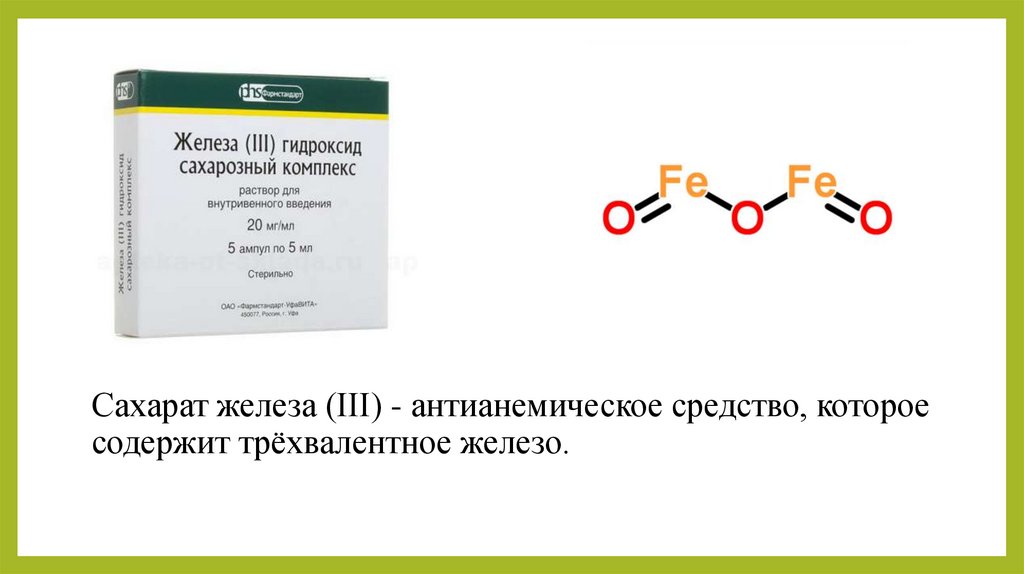Сахарат железа (III) - антианемическое средство, котороесодержит трёхвалентное железо.